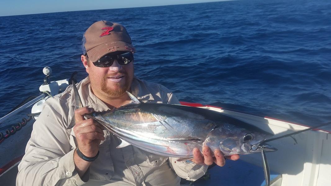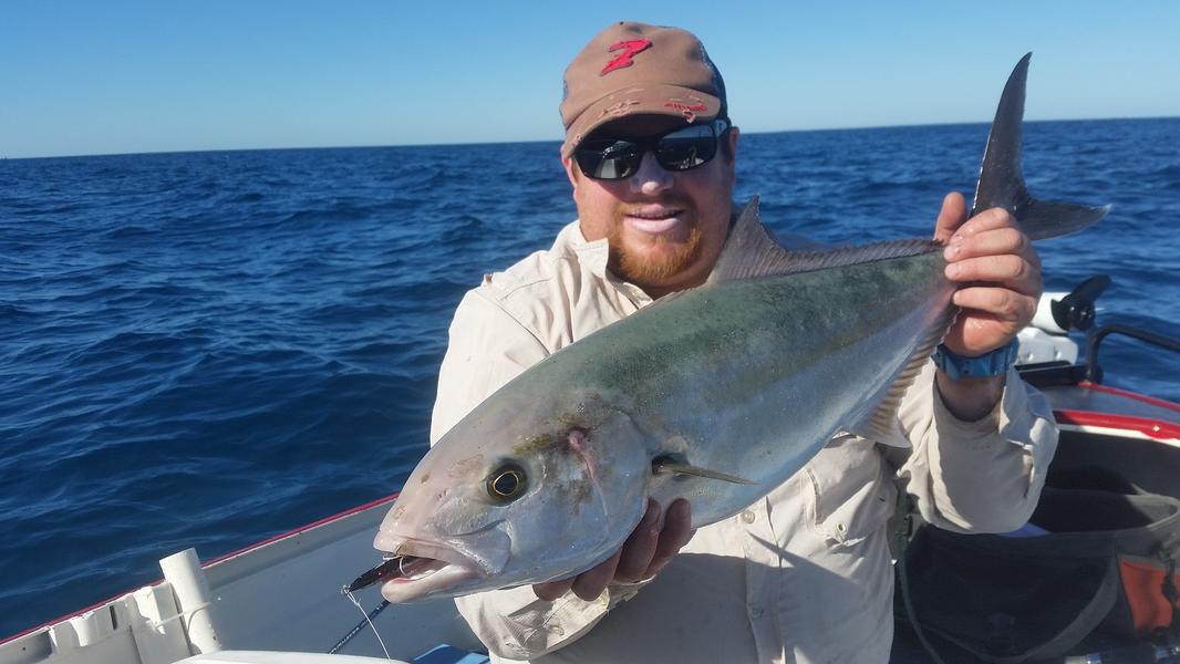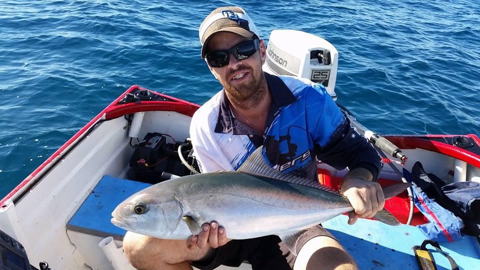 got to the ramp at 5 and were on the selected location by 530. quick sorting of the tinny saw us ready to go, almost straight away there was an eruption on the surface , so brett armed with a zipbaits monsoon breaker stickbait shot it straight into the disturbance and before one rotation of the handle was complete all hell broke loose ! first cast of the day and tuna landed... essentially this lasted the whole morning with bait and bust ups everywhere and in every direction ... ended up landing bulk tuna , amberjacks and tailor all on surface gear which kept us well entertained. Also managed to be graced with the presence of an overly large shark that was easily over the length of the tinny!