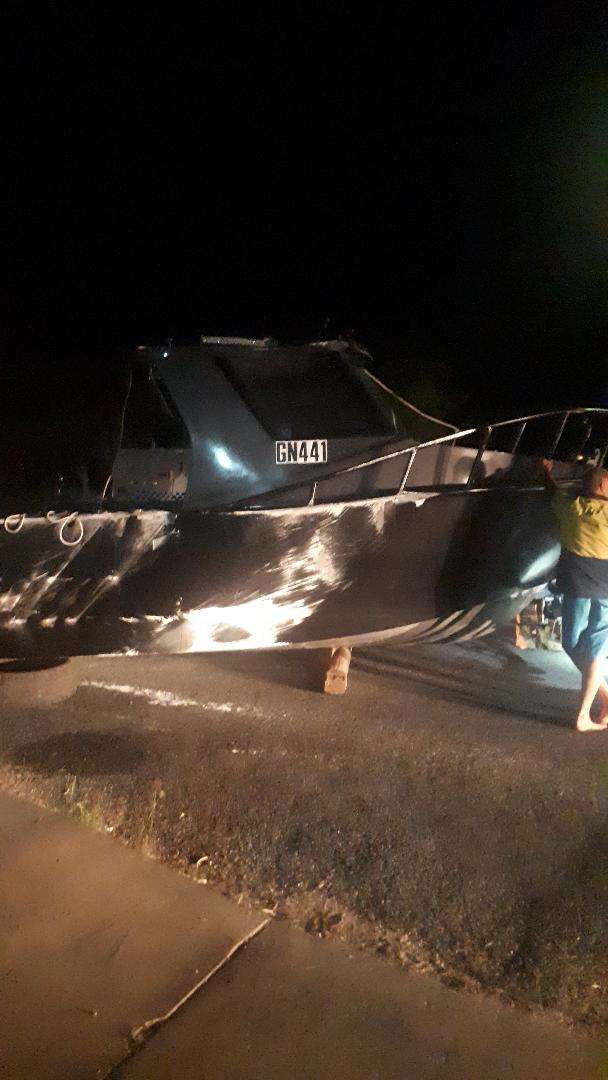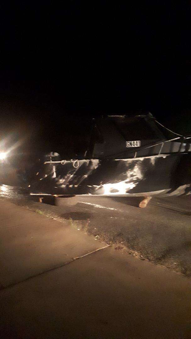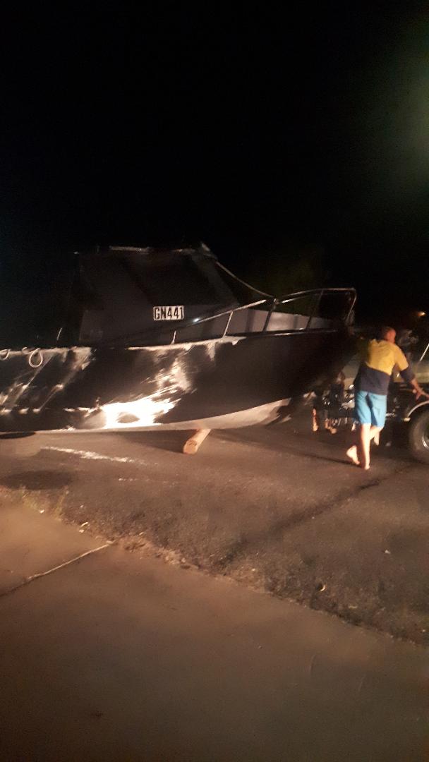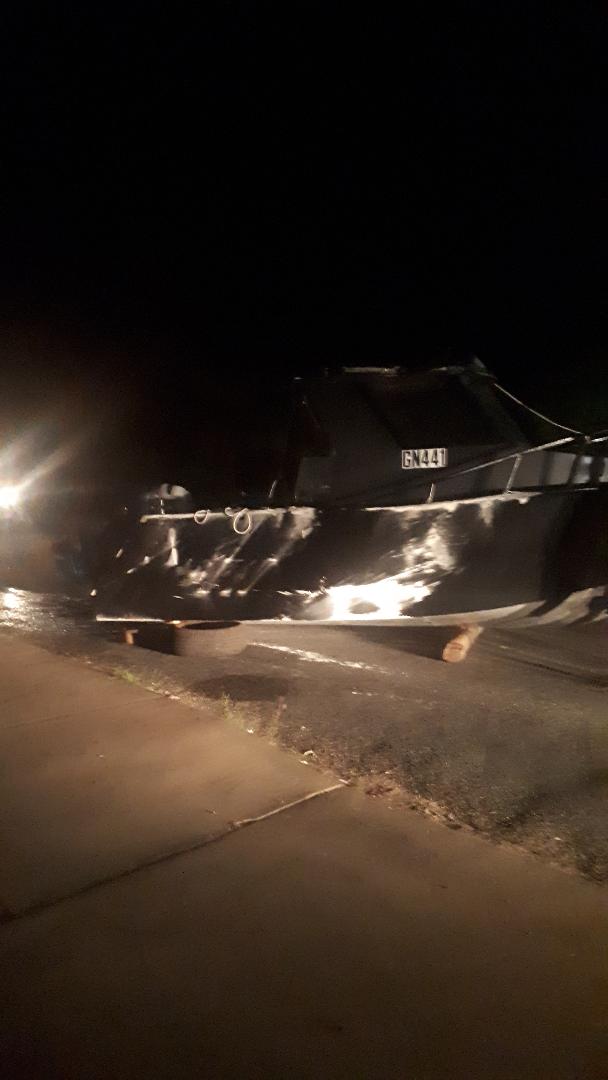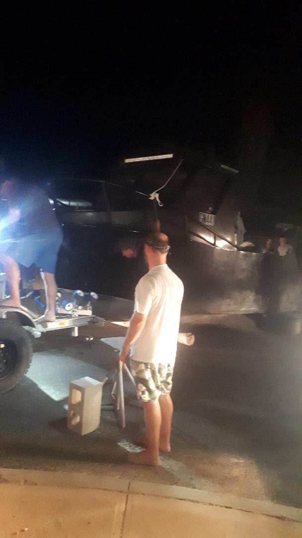 Heard a great bang and scraping out front of son's place in Exmouth. All rushed outside thinking something had collected all our cars parked out front and found a big ally on it's side about 50 metres up the road. They had clipped the kerb gone across the road and hit the kerb again tipping the boat off the trailer and dragging it up the bitumen.