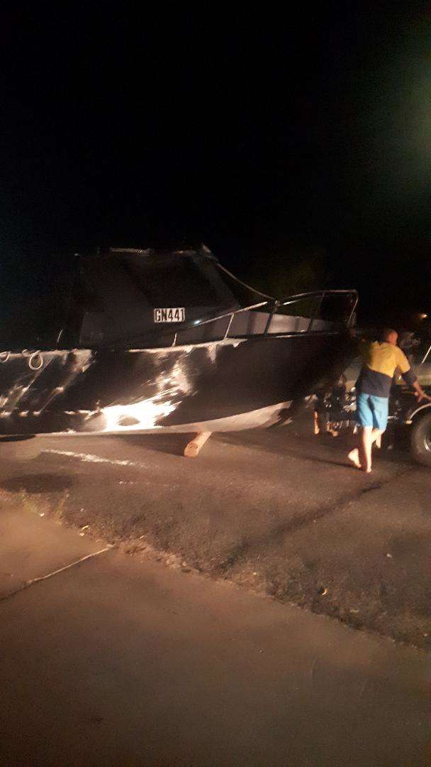 Going by the tyre marks on the kerb out front, it looks like the trailer wheel hit the kerb out front and flipped the boat off and onto its side, then he's dragged it some distance up the road before stopping with the boat still on its side .