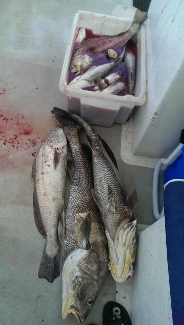 Went on a charter today, 16 people and the boat bagged out on Mac's, Black Jews and Gold snapper ( finger mark )