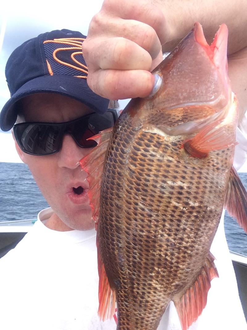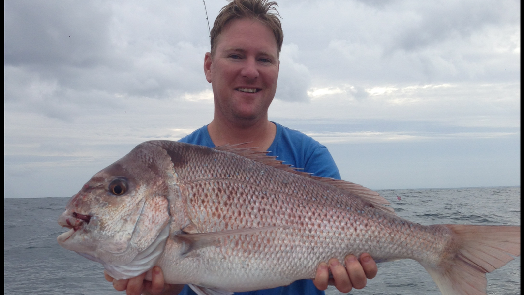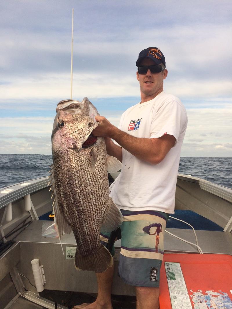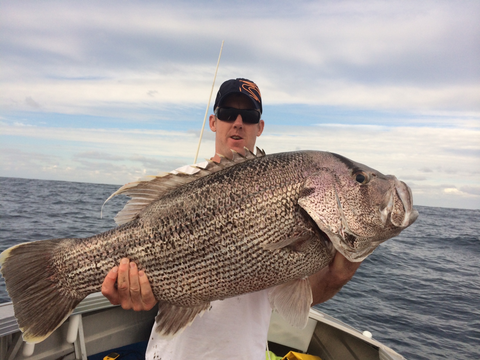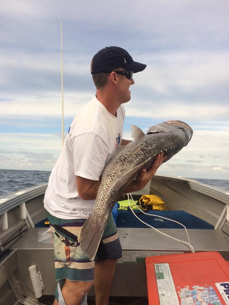We launched in the dark hours of morning for a sloppy ride 16 miles out in the tinny to an area I know holds good dhu, and after a slow start on a few rat sambos and just undersize pinkies, came across a slight change in ground conditions. I looked at the sounder and said there's a few arches just above the change, when Corky's rod buckled over in defiance...