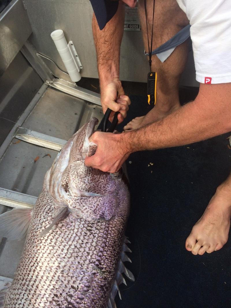 He recently spent some of his telethon money (thanks channel 7) on a nice pe2 light jigger and his 4000 twin power was singing with what I first thought was another, bigger, sambo, before a bullshit power run straight down had me second guessing it was a decent shark. He stopped it just before it bricked him, and turned him back up slow and steady to the surface for a few more minutes, with a look on his face that could only be likened to that of "the chunk" from the goonies. a few bubbles popping up had me realizing it was no shark. When it finally broke the surface, and no gaff on board, I put both my hands down its gills, and heaved the big dhu over the side.