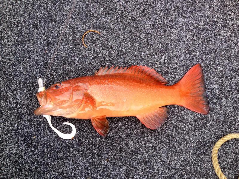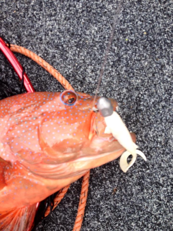 I continued to jig with a plastic but it was looking grim. But all of a sudden, BOOM a solid take and I though it had to be a sambo, with how much it weighed, but its runs weren't very fast so I was starting wonder. After a couple more minutes I got it closer to the boat and called it for a big shark, when it saw the boat it peeled a little more line off, again backing up the call for a shark. My Static 5000 with PE 3 was almost locked and I was just able to pull it up, the Temple Reef Mytho sure had a good looking bend in it, handling itself nicely. I managed to pull it up a little more and before long it was next to the boat but still a little green and it wasn't a shark.