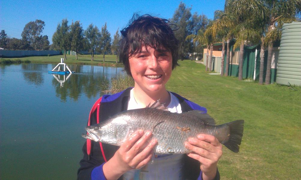 today i went to golden ponds, at first there were heaps of koi eating pellets of the surface so it wasent taking my bait so i jaged it, then it took a strong run and i pulled the hook. I also jaged a barra and landed it. The barra measured 54cm . there were heaps of trout and silver perch and i also got a silver perch on a soft plastic.