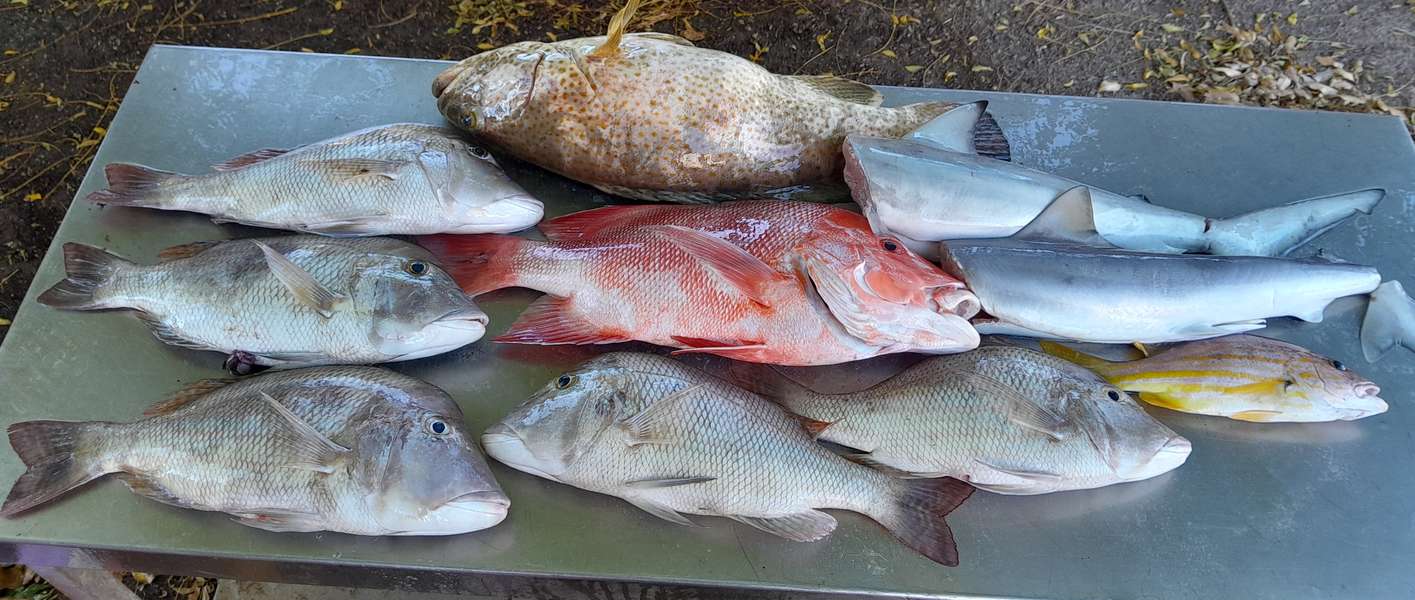 The weather turned it on for us altho a little bit sloppy going out. The current was absolutely ripping drifting at almost 2 knots with no wind. Once we found some fish we set the minn kota and needed 24 Oz to hold the bottom in 22 mtrs of water. First line down at 9 and last line up just before 12 . Great day out and not complaining about the catch.