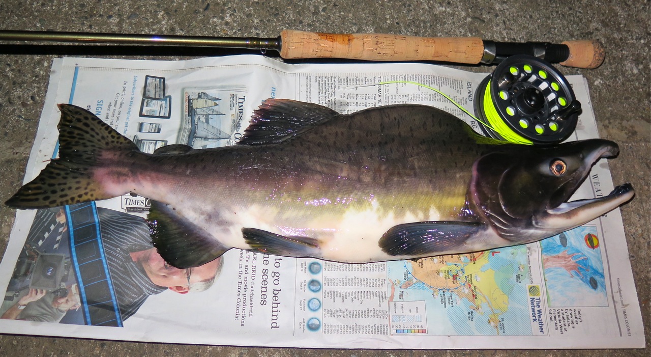 Have caught several more 3 - 5 lb male Pink Salmon since this one. Sadly, the big males are very, very ordinary eating once they've gone 'humpy'.