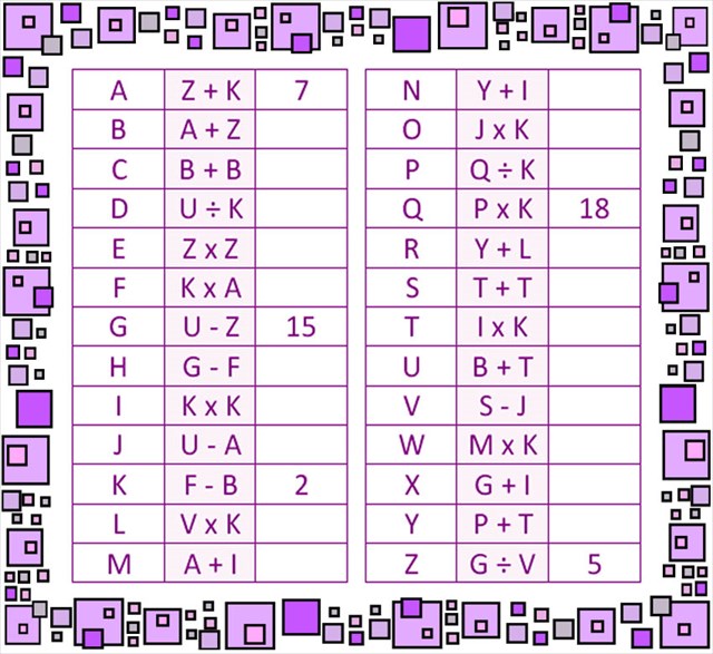 A7, b 12, c24, d10, e25, f14, g15, h1, I4, j13, k2, L6, m11, n21, O26, p9, q18, r23, s16, t8, u20, v3, w22, x19, y17, z5.