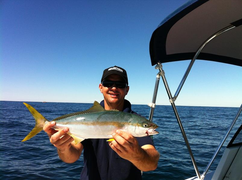 Pretty soon the decky was adding to the burley (conditions were excellent, he is just soft as) and I managed a couple of nice blackarse around the 35-38cm mark, and a good size skippy. The deckie was spewing with increasing frequency and was considering invoking the mercy rule (knowing full well that he would have to forever wear the "panties of shame") until something put a nice bend in his little spin outfit. A brief struggle later and a small 50cm YTK was on board for a quick photo before swimming away strongly. The decky now reckoned he was feeling much better. Decided to head back in as the girls back home were getting impatient, and the breeze had just shifted around. Stopped at GI for a quick visit, and then headed back to the ramp. This is where the fun started!