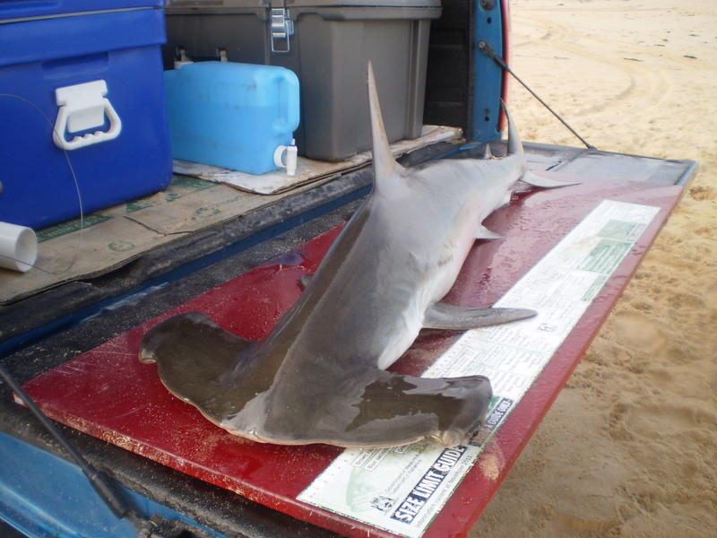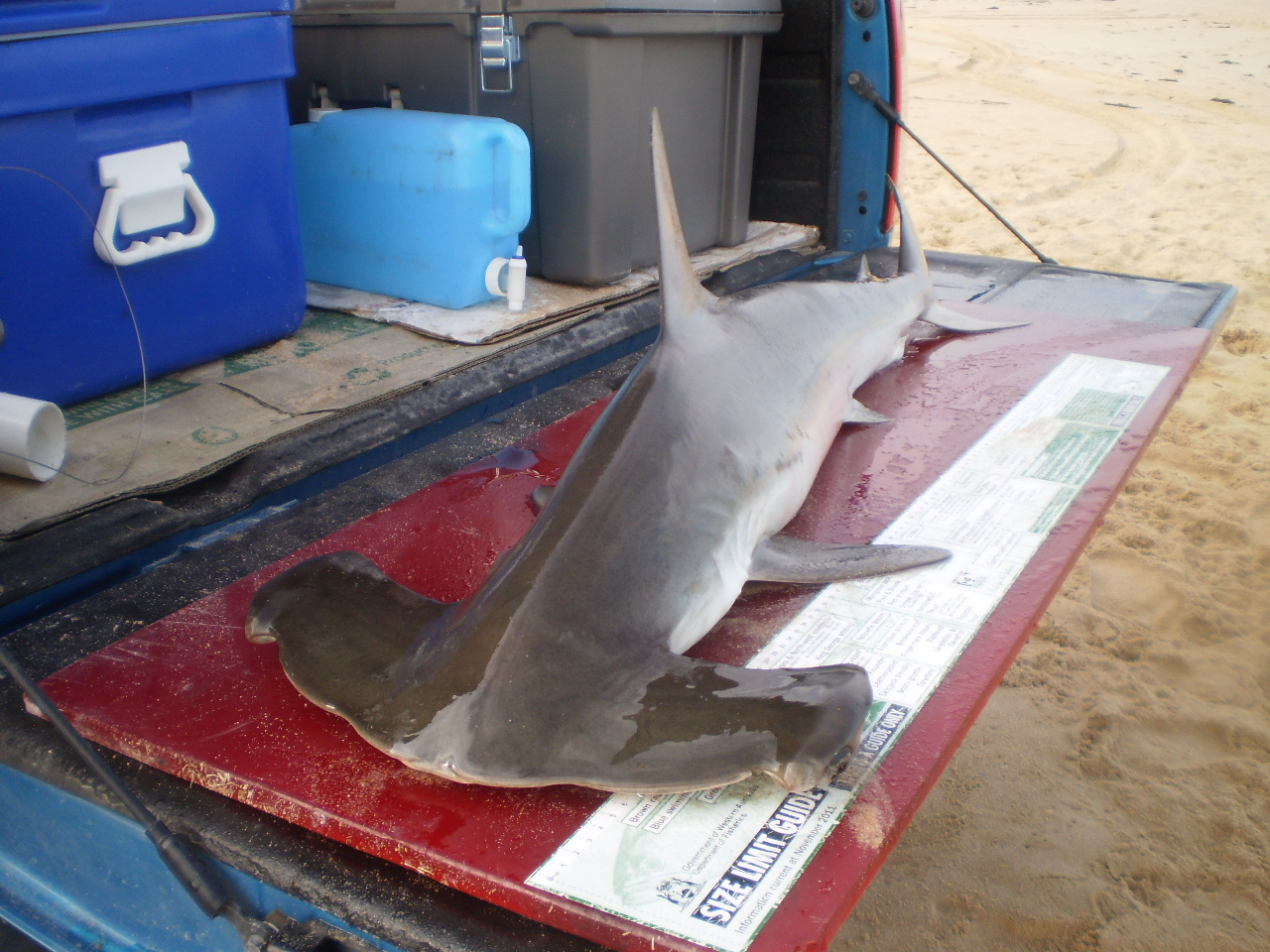 After a couple of hours of changing the live Herring (and having a huge breakfast), I was starting to think I should have stayed home and had a crack at a dawn service. Not even a Ray! Then finally one of my lines screamed off. After a couple of decent runs I beached a Hammerhead Shark. Not huge like some of the beasts posted on FW but a good size for a feed. DJ really didn’t like Mr HH and I literally had to break those two up.