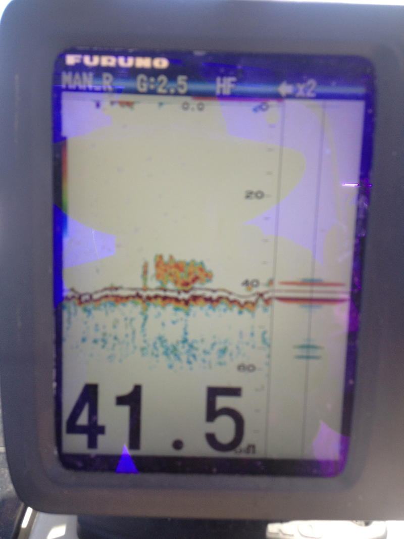 A bit quiet after this for quite a while. Not sure if the released fish spooked the school as they were still showing up on the sounder or whether the bite was on early in the day. Here is a sounder shot of a smaller school, the first school I came across went across the sounder screen for quite a while. Still learning with the 587 this shot has the white line on at I think about 5 or 10%.
