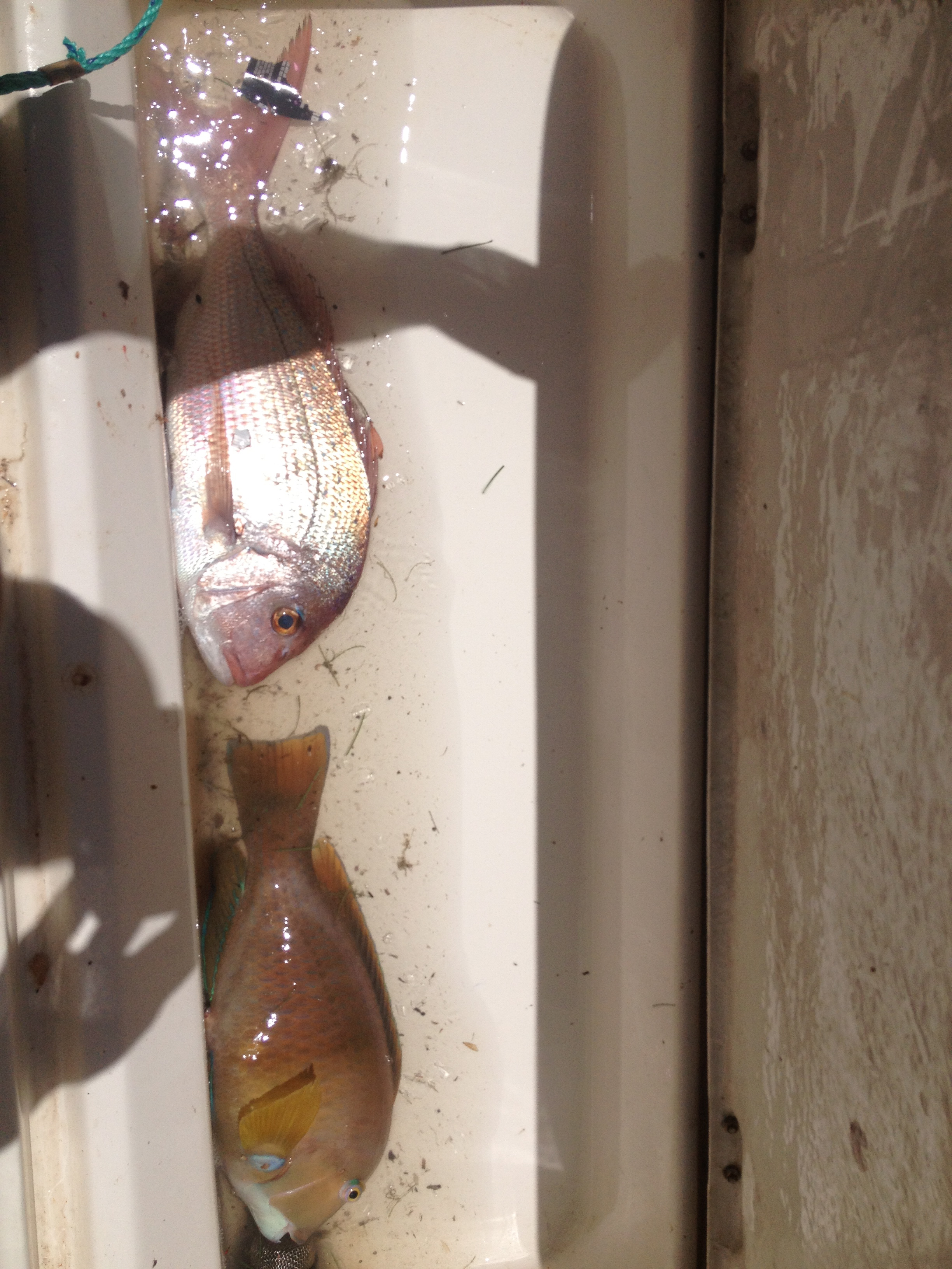 Got out to a couple of marks in the 40's to find the sounder light up. Dropped down a Daiwa Pirate jig while getting the bait outfit baited up. I didn't even get to bait up as the jig got hammered as soon as I flipped the bail arm over. Up came a 45cm pinkie, released on the weight probably didn't need the release weight but better safe than sorry. Dropped the jig down again and same thing happened, a little bit smaller than the first. A good start but nothing size yet. Finally got some bait on the other outfit and managed a 51cm Pinkie.