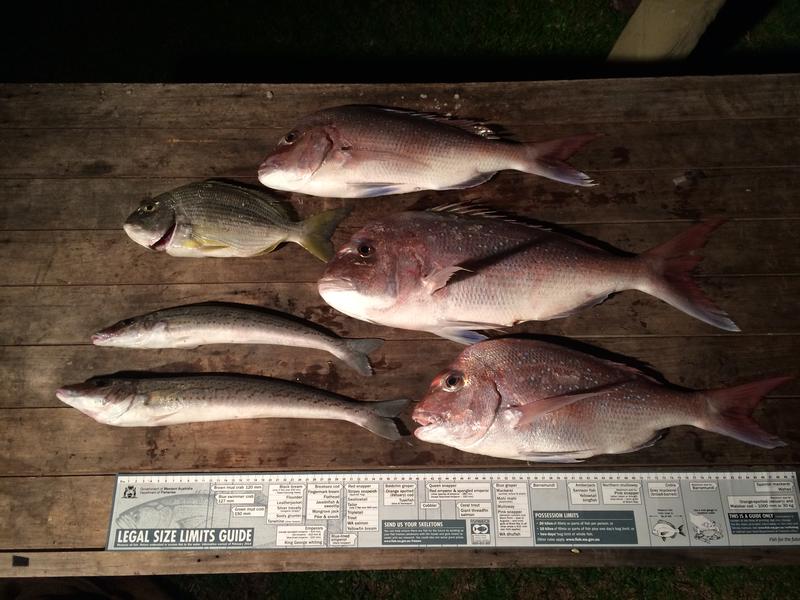 Our evening produced 10 pinks, 2 king george, 3 large (>1m sharks), the 50cm dhu, 3 tarwine, 2 big rays, 2 sargent baker and some skippy, with various other low quality throw backs. The photo shows what we kept for the night – and we also kept the sb fillets for the bait store. What a lovely end to the school holidays. Winter fishing in WA is awesome.