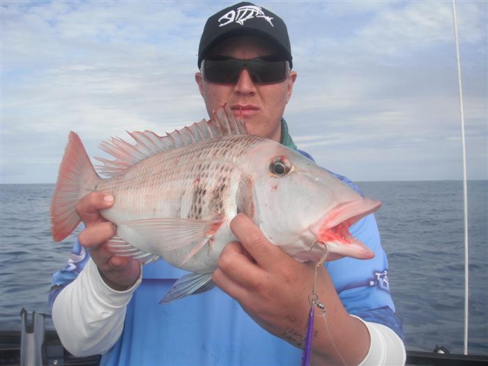 After spending an hour or 2 catching 1 - 4kg Sambos mixed in with heaps of 450 - 600mm Pink Snapper, the weather was getting better and the storm front seem to be holding off and with no sign of rain coming we headed for a mark I had been hanging to drop jigs and plastics on for quite a while.....