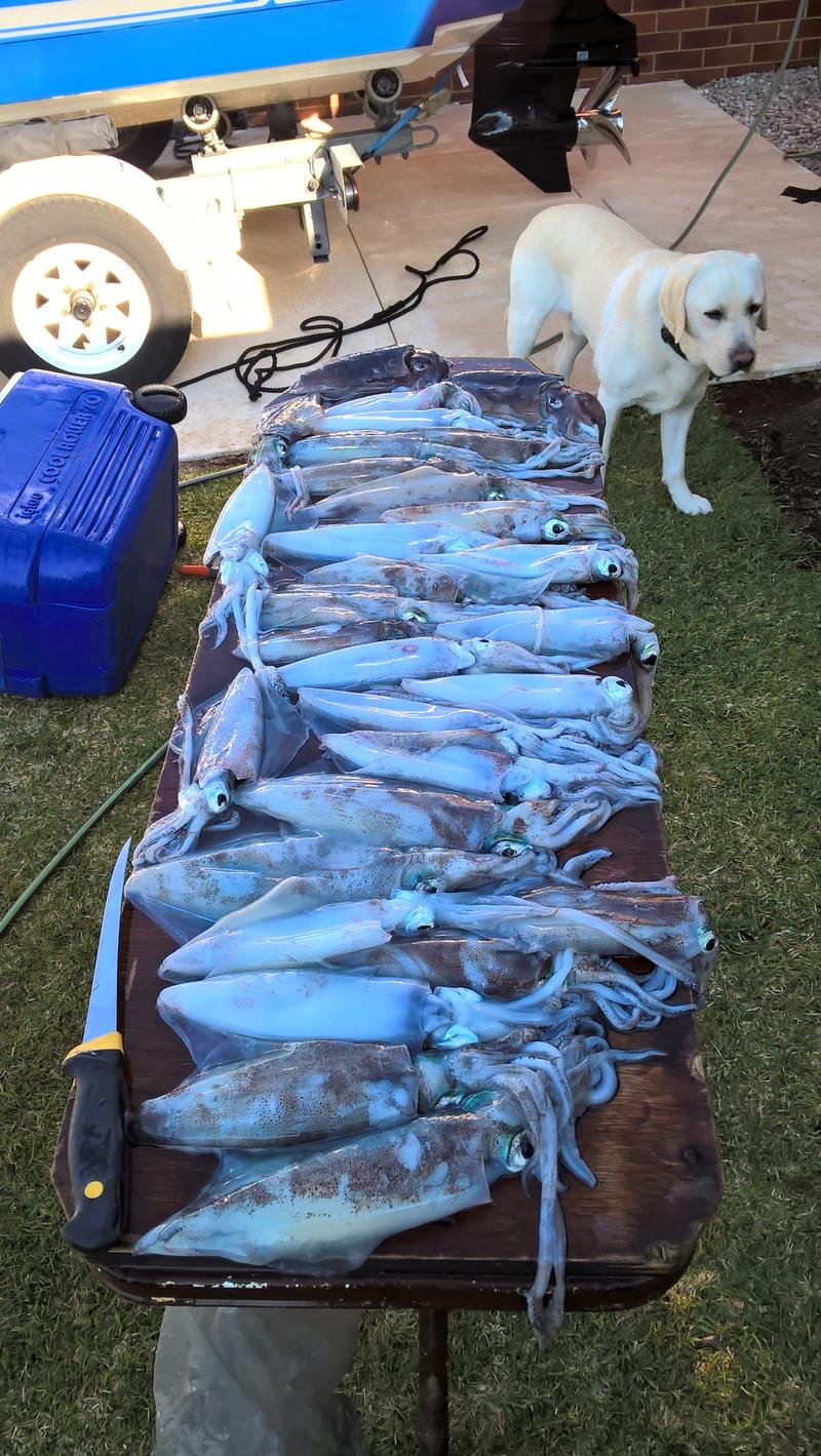 Managed to shoot out on Saturday with the family in the tub. Late start in the water just before 9:00 after having safety gear and skippers ticket checked at the ramp which was good to see. Straight to the squid patch and into them. Had a few good laughs with wife and kids coping a few direct hits from angry cephs as they came over the side. All done by 12:00 with a double bag. Had a good feed that night with a few more in the freezer for later, and packed a few solid bags up to hopefully convert to reds up at Coral Bay in a few weeks.