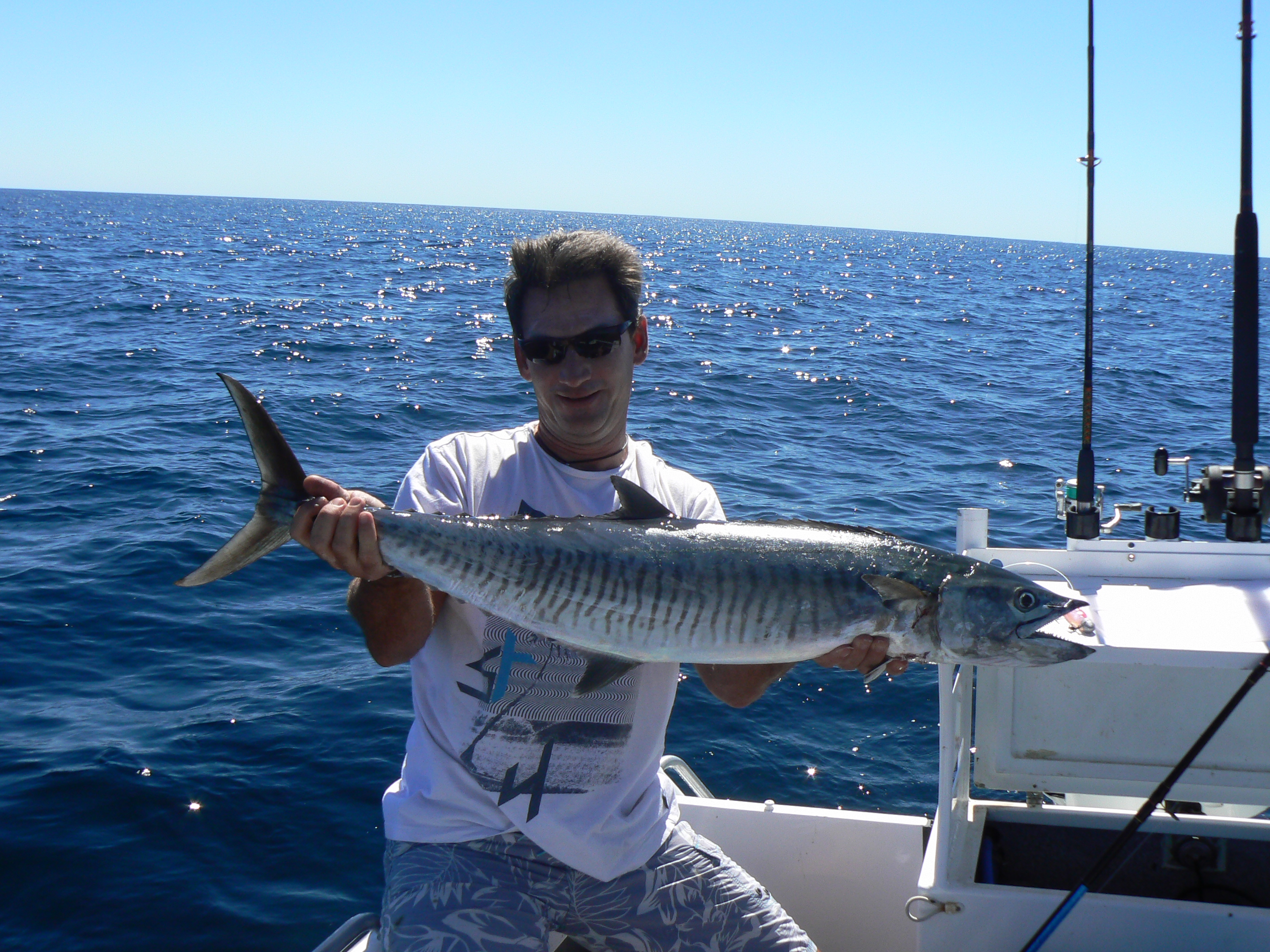 G'day went for drive along safety bay sat arvo about 5.30 and seen what looked like spanish mackerel jumping approx 100mtres in front of bp servo and looked pretty big so decided to go home get boat and have quick troll got to ramp could still see fish jumping so thought would have good chance got out to spot no sign of any fish chucked out lures but to much weed headed home aw well maybe tomoro. Left point peron sunday about 12.30 with a light sw headed for back ffb got to spot approx 25mtres and my deckie got this spaniad on a deep diver,tried for another half hour no hits headed for west end rotto heaps of bait fish around trolled for hour no hits so headed home anyway was a great day and the deckie was stoked. Cheers, Nick