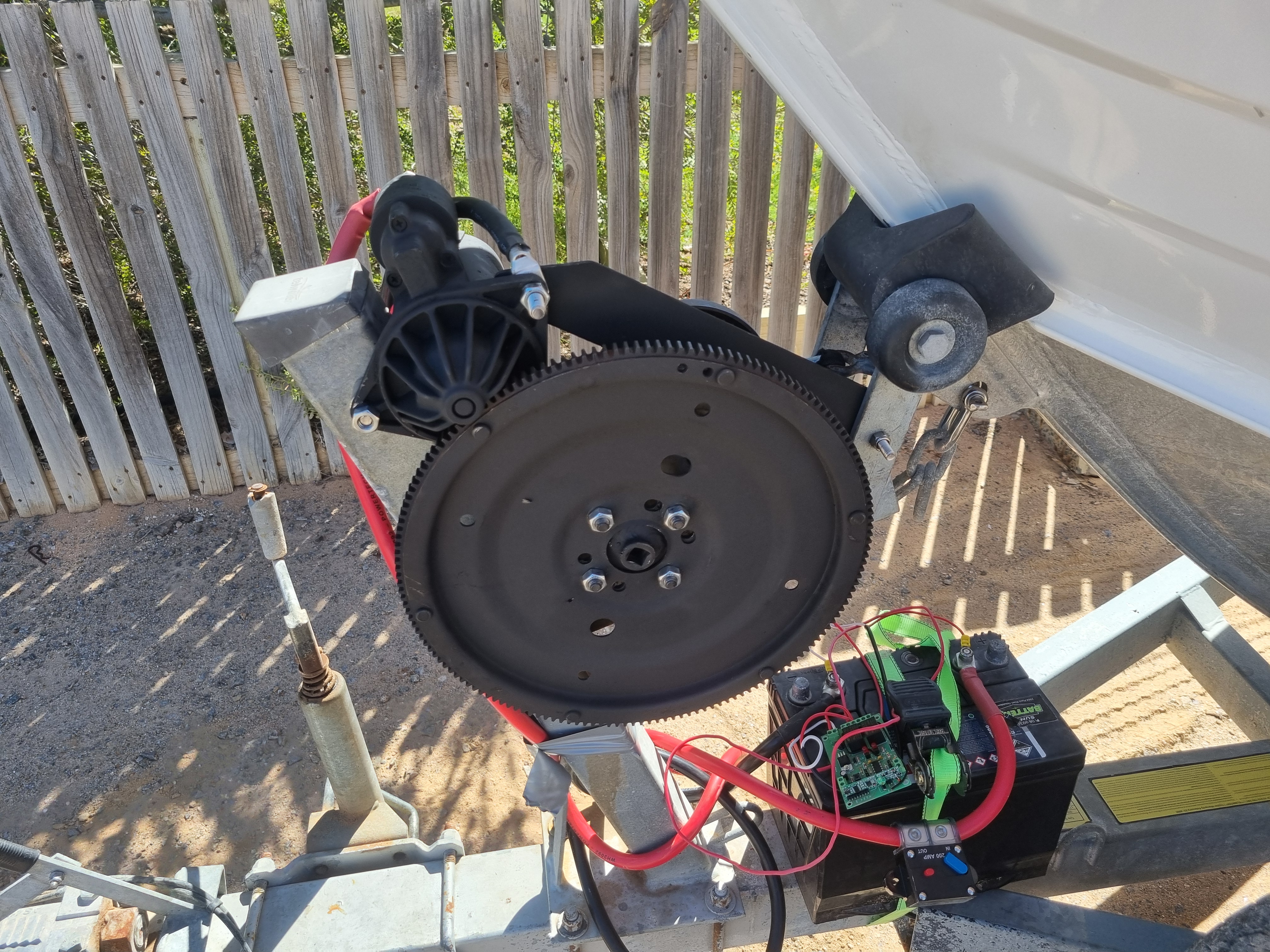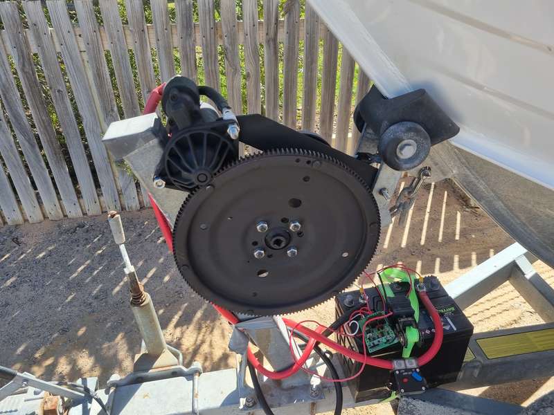 It's a BA ford starter motor with matching flex plate, originally I was going to use a reduction starter but my younge bloke has this laying around so thought I would try it. Turns out it works fine! When it starts failing I'll use a reduction motor instead of rebuilding the existing one. I've had it on for a couple of months now and hasn't missed a beat, pulls the boat up in 20 seconds (using the lower gearing on the winch due to size of starter. Can still pull the trailer under the boat when beach retreating, not sure on time as just did it as a test)