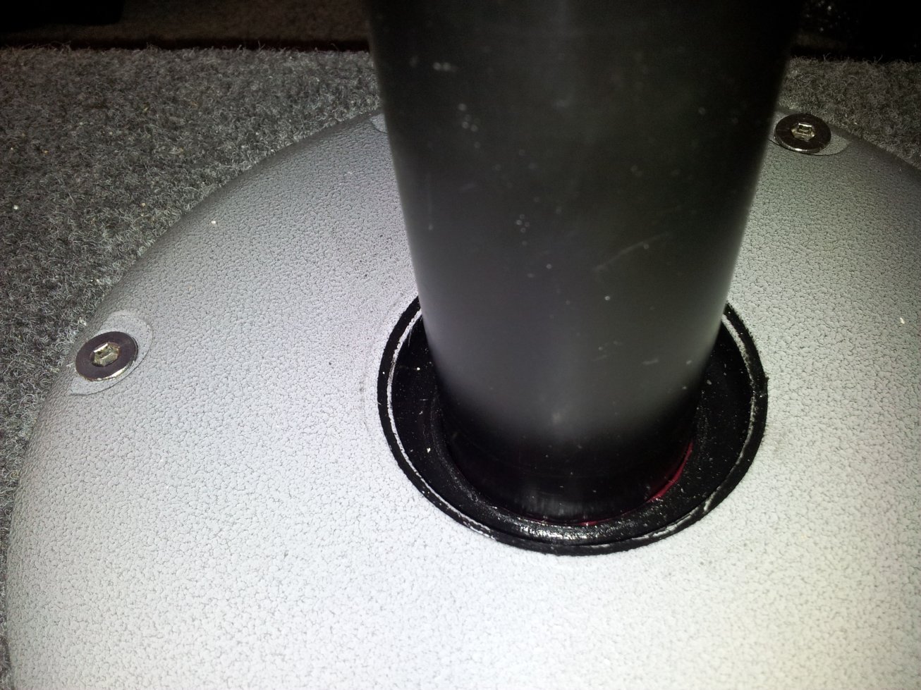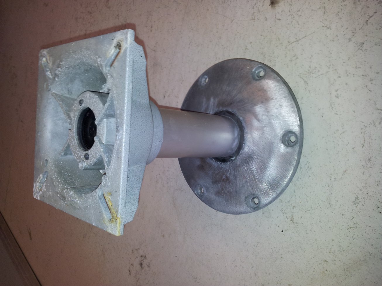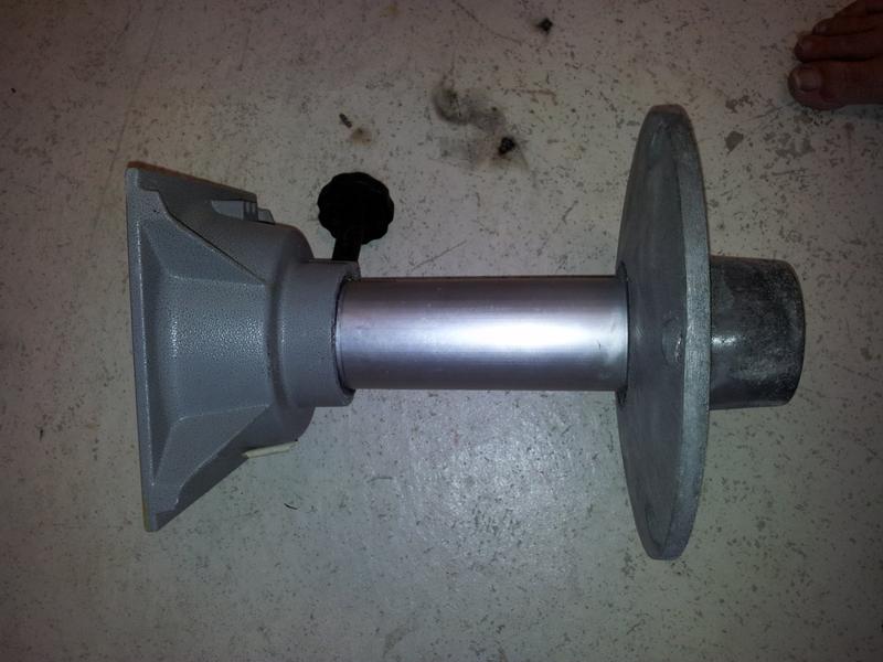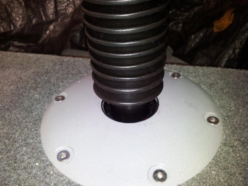 The most time consuming part was to machice down the old chair base thatwas made of plastic. Did it old school, started with a grinder cutting disc, then a bastard file to get a almost perfect fit so as the sikaflex takes up any last inperfection, locking the plastic sleve cutdown from the base into place.